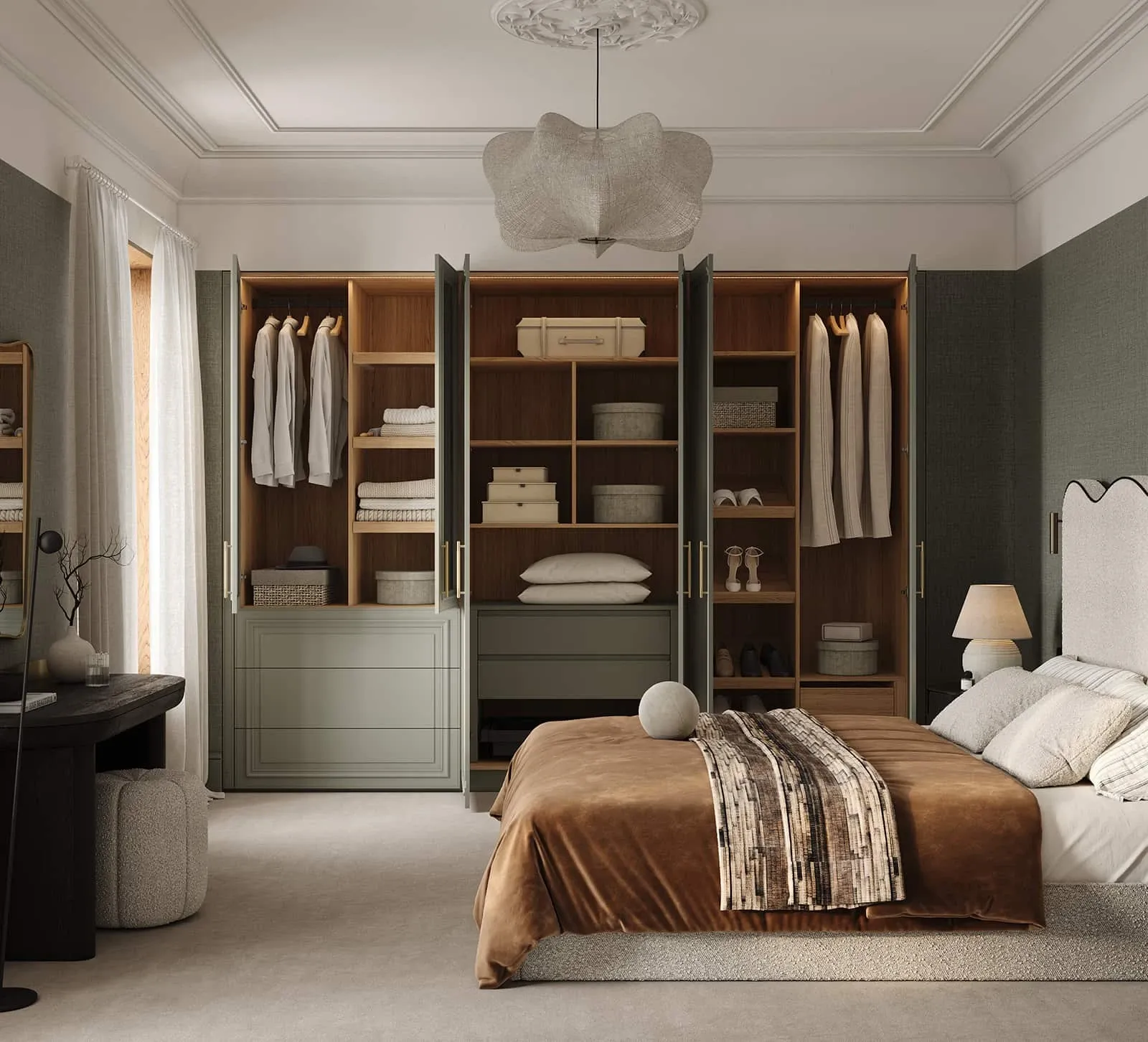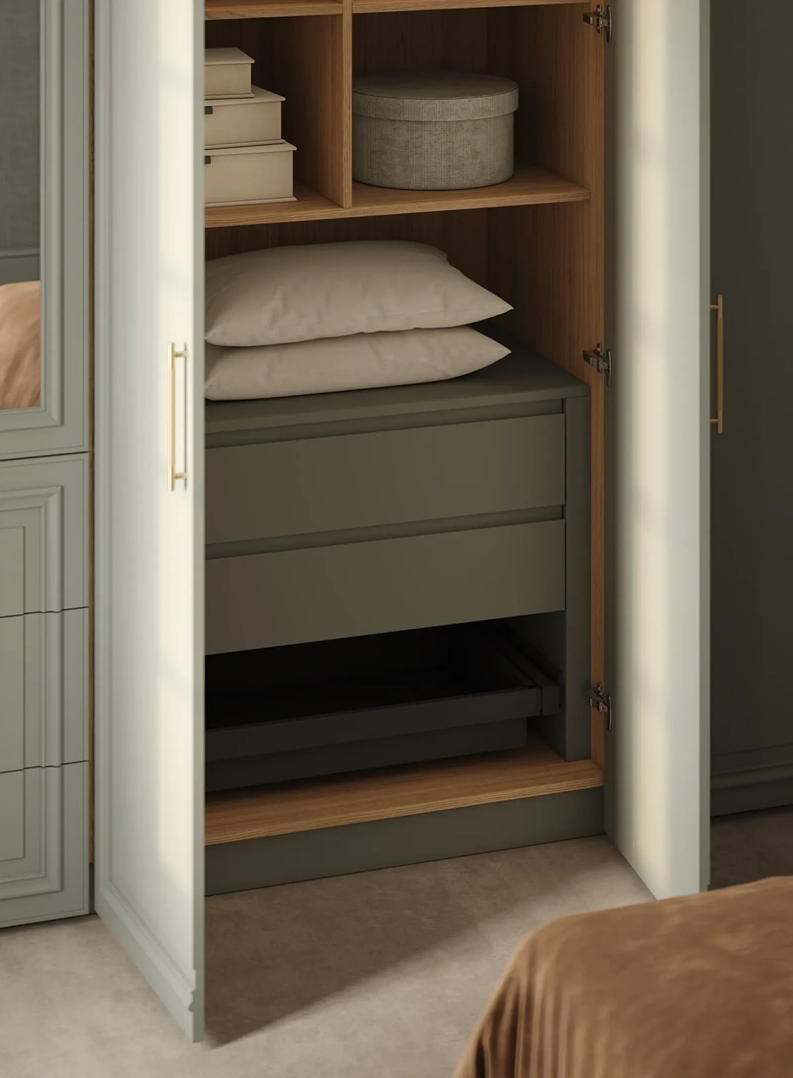 КАРКАС, ПОЛКИ, ВЫДВИЖНЫЕ ЯЩИКИ, ЗАДНЯЯ СТЕНКА ЛДСП, декор Дуб Медовый / крашеная МДФ, цвет NCS S 3005-G20Y Матовый ФАСАДЫ Т654 Крашеная МДФ, цвет NCS S 3005- G20Y Матовый