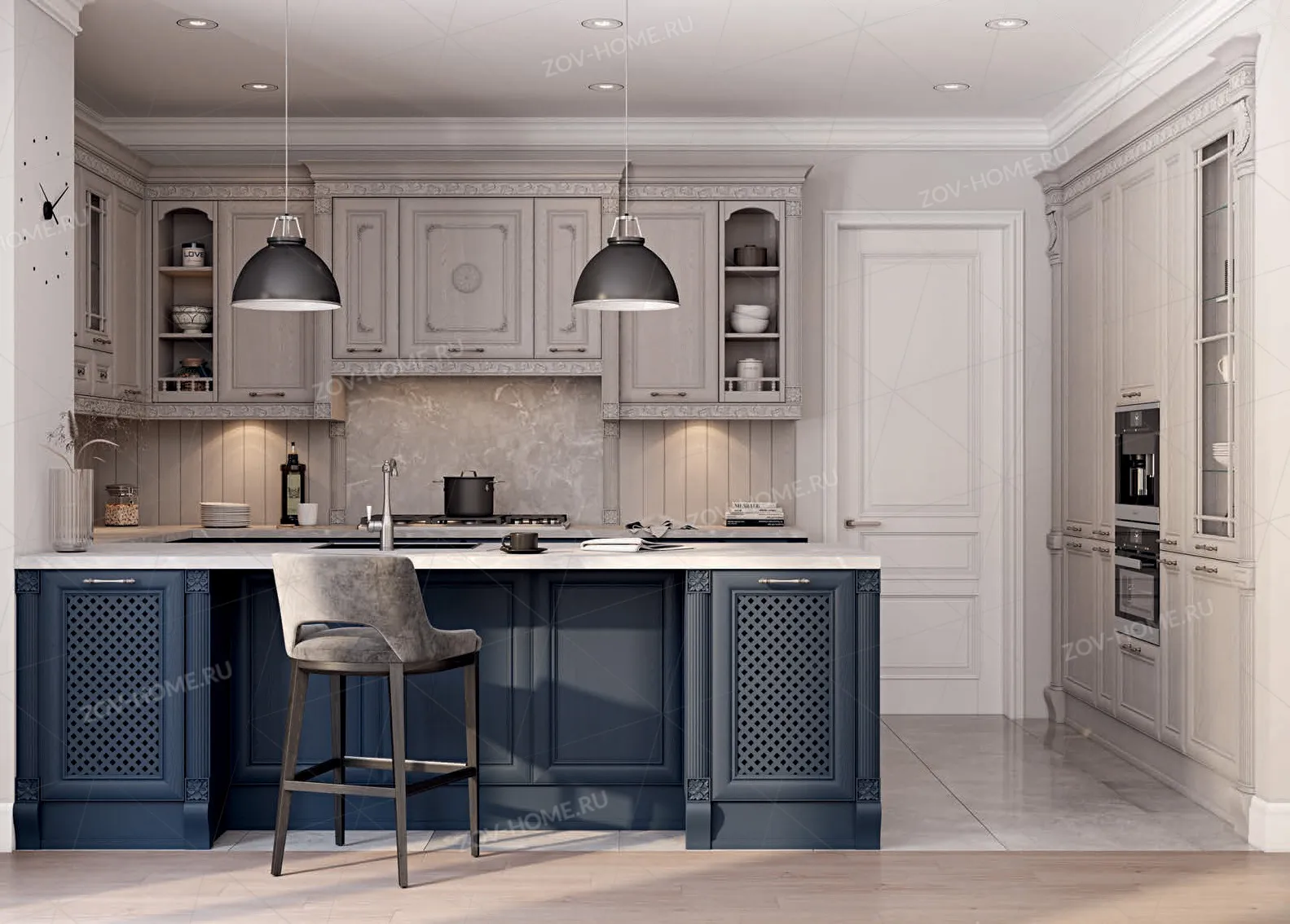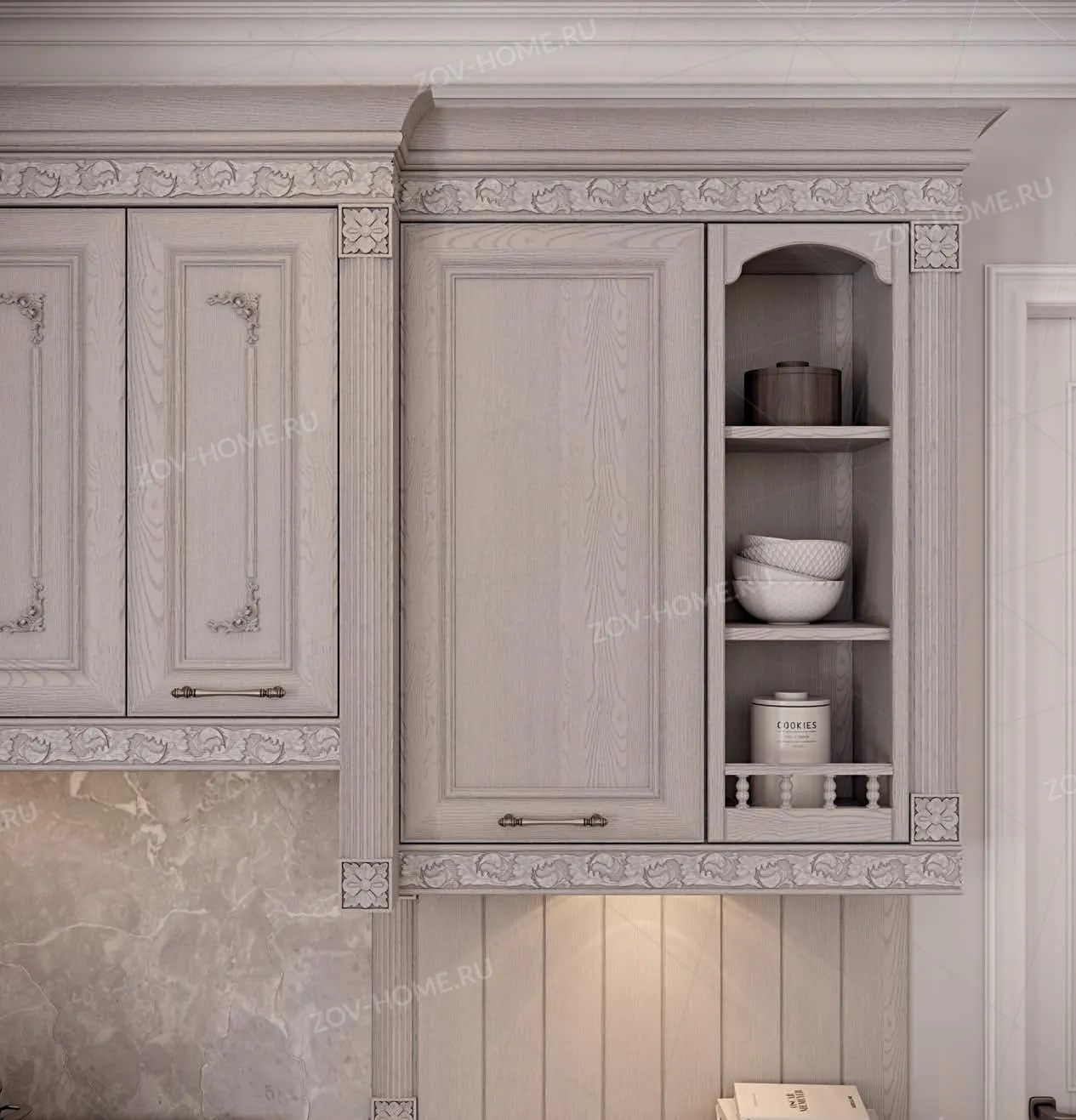Декоративные элементы: Пилястра #5; опора нижняя декоративная ОНД-1 (150 / 75), ОНД-1 (150 / 150); багет Б-3K Комби прямой (вставка гладкая); накладка декоративная НМ-2 (ширина 296 мм); плинтус мебельный ПМ-3 прямой; лепнина-3; панель декоративная БПД-6-1; вагонка, цвет NCS S 2000-N; угловая развязочная планка НМУ