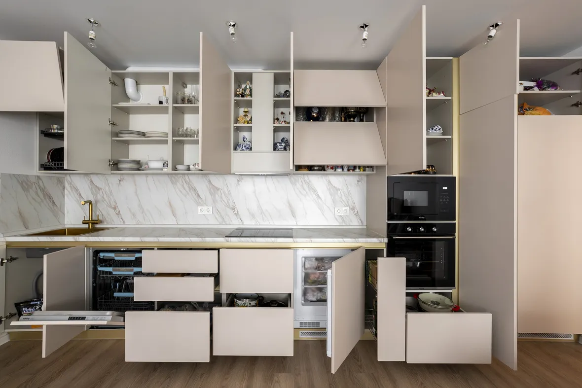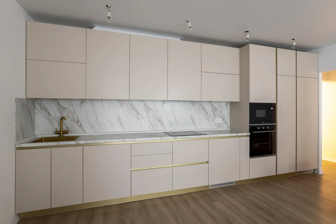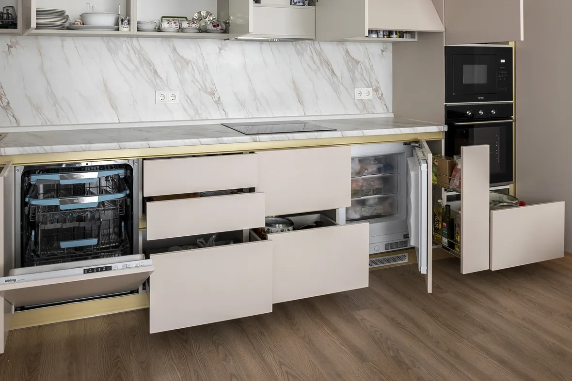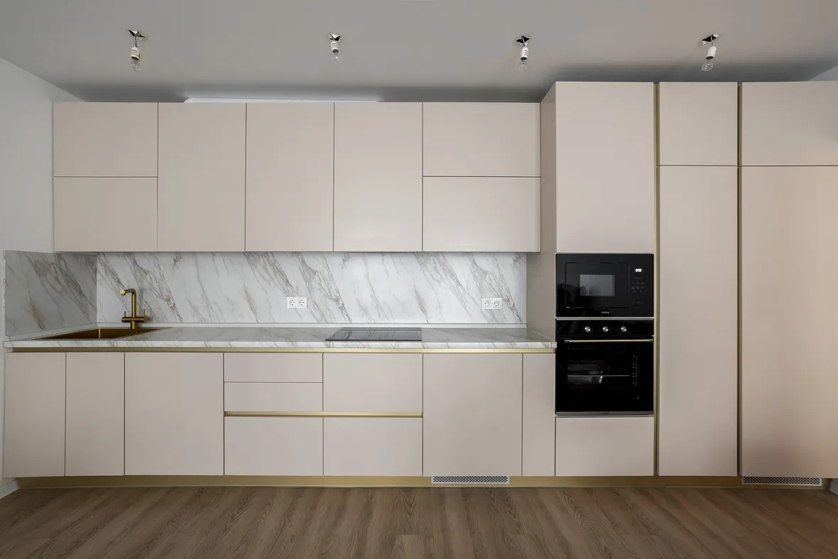 Техника: встроенный духовой шкаф, встроенная электрическая варочная панель, встроенная СВЧ, встроенная ПММ - KORTING, встроенная вытяжка - EVELUX, мойка и смеситель - EMAR