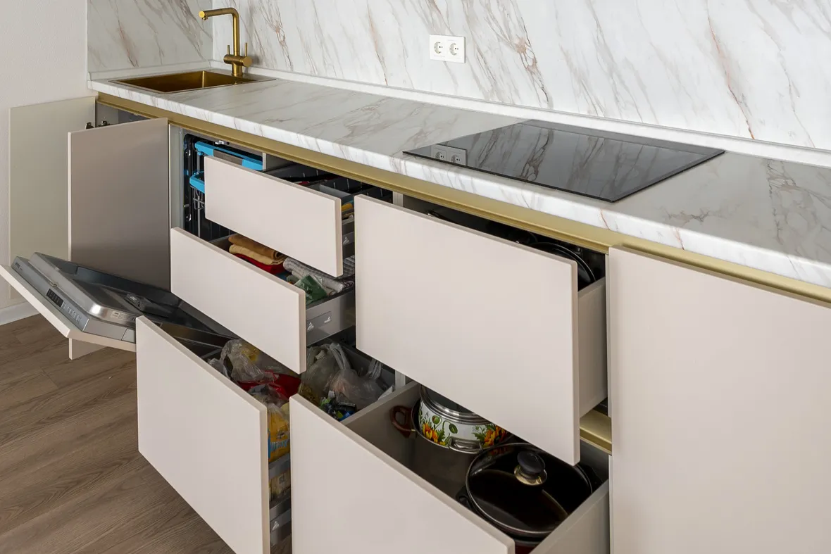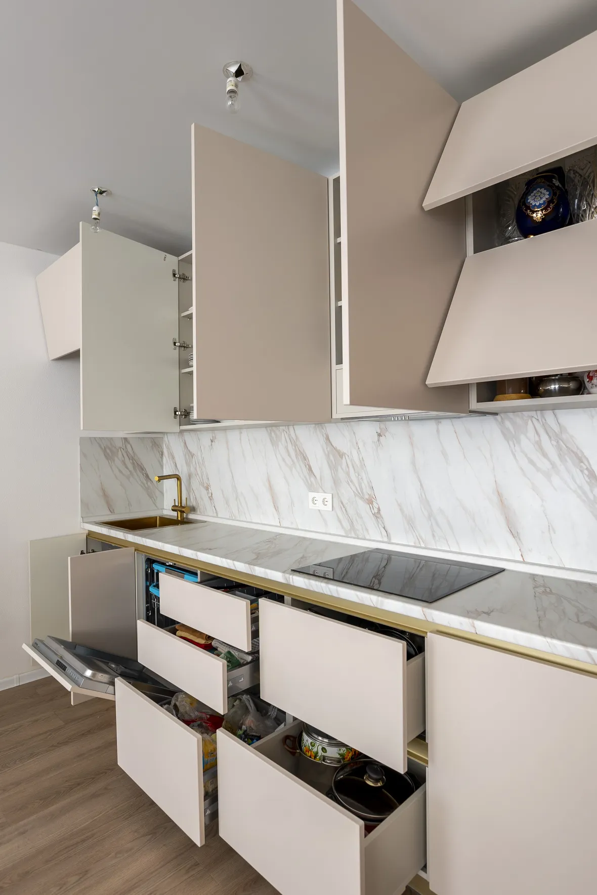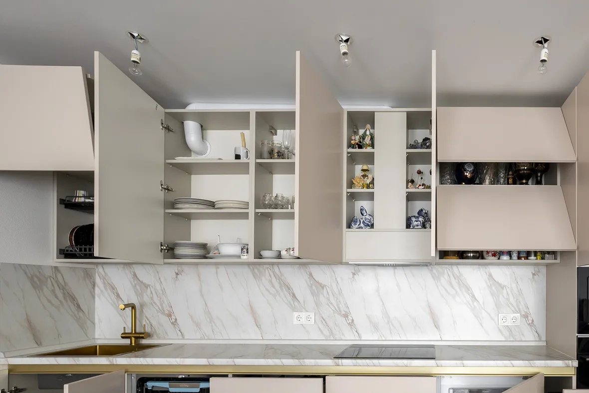 Техника: встроенный духовой шкаф, встроенная электрическая варочная панель, встроенная СВЧ, встроенная ПММ - KORTING, встроенная вытяжка - EVELUX, мойка и смеситель - EMAR
