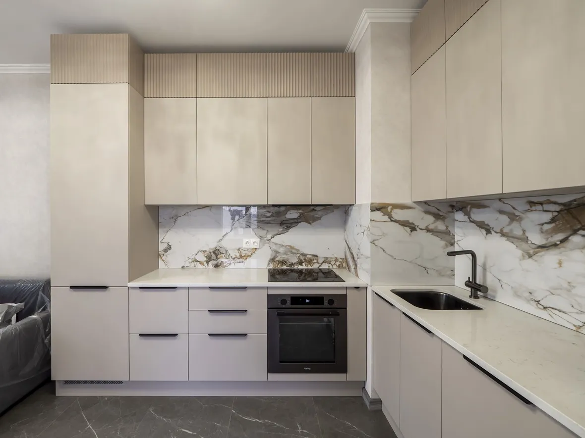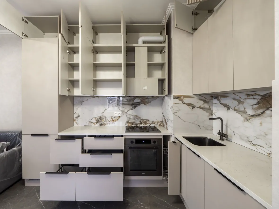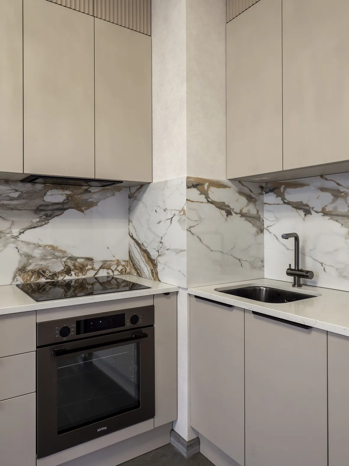 Техника: мойка и смеситель - EMAR, измельчитель - BONE CRUSHER, встроенный духовой шкаф, встроенная электрическая варочная панель, встроенная СВЧ, встроенная вытяжка, встроенная ПММ, встроенный холодильник - KORTING