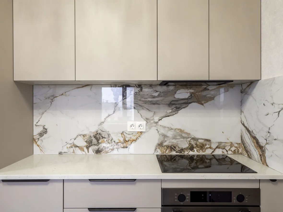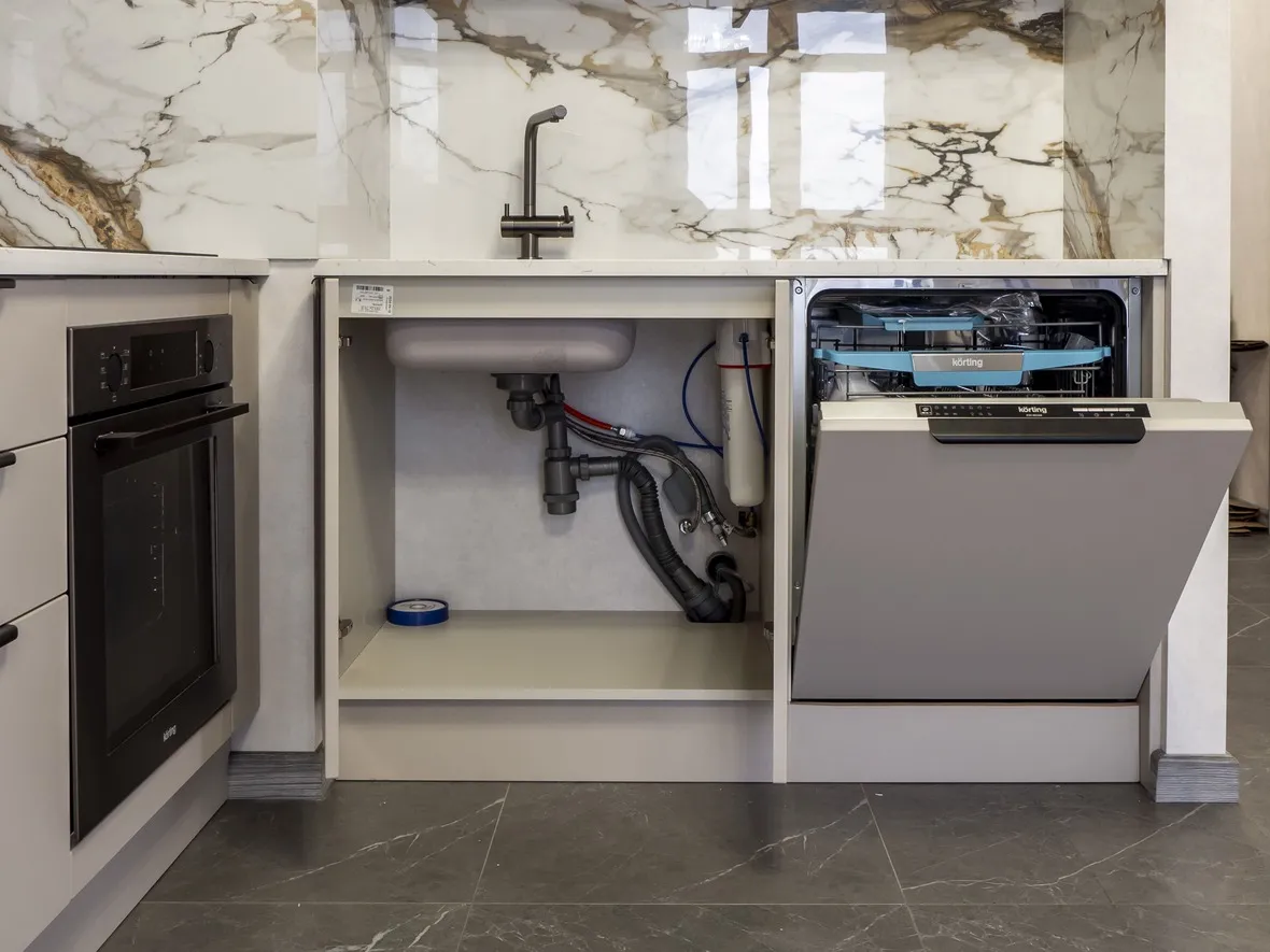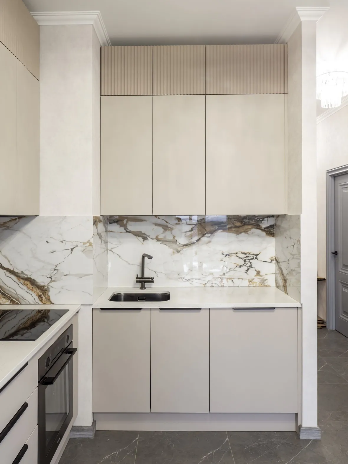 Техника: мойка и смеситель - EMAR, измельчитель - BONE CRUSHER, встроенный духовой шкаф, встроенная электрическая варочная панель, встроенная СВЧ, встроенная вытяжка, встроенная ПММ, встроенный холодильник - KORTING