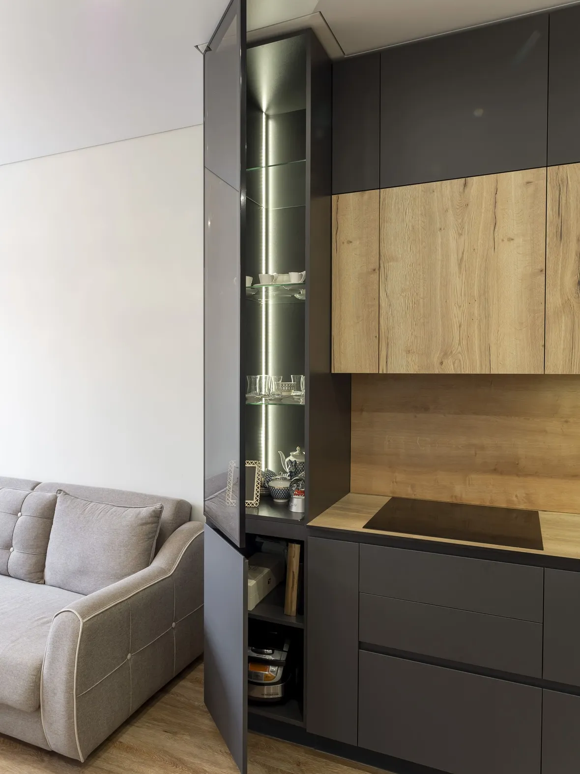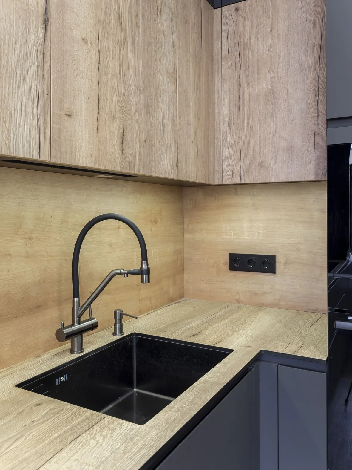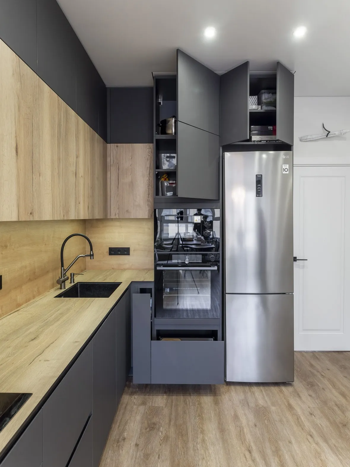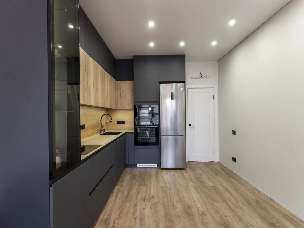 Техника: мойка и смеситель - EMAR, измельчитель - BONE CRUSHER, встроенный духовой шкаф, встроенная электрическая варочная панель, встроенная СВЧ, встроенная вытяжка, встроенная ПММ, встроенный холодильник - KORTING