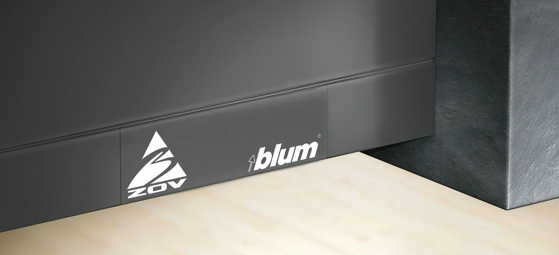 Особый акцент на бренде «ЗОВ» является также частью дизайна ящиков LEGRABOX от австрийского производителя BLUM. Логотип «ЗОВ» располагается на заглушке металлической боковины выдвижной системы вместе с логотипом производителя.