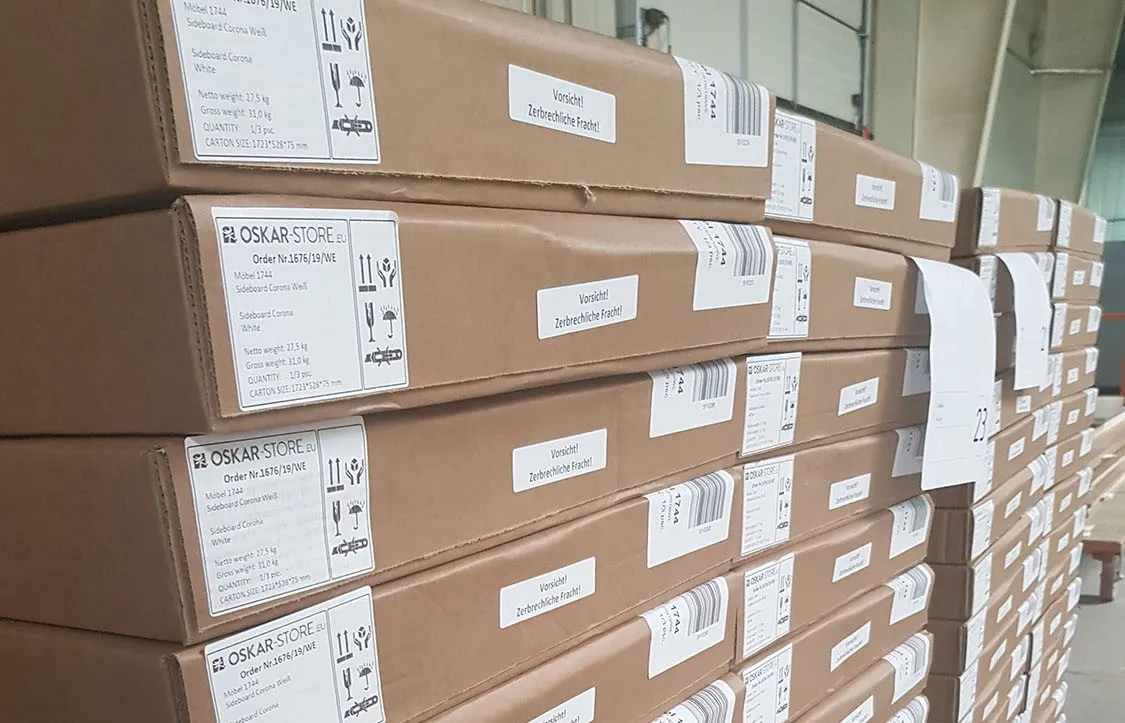 Только каркасы из ЛДСП и только в разобранном виде упаковываются в картон на полуавтоматической линии без использования клейкой ленты (скотча). На каждую коробку клеится этикетка с наименованием и юридическим адресом производителя, наименованием клиента и номером заказа, краткой информацией об изделии.
